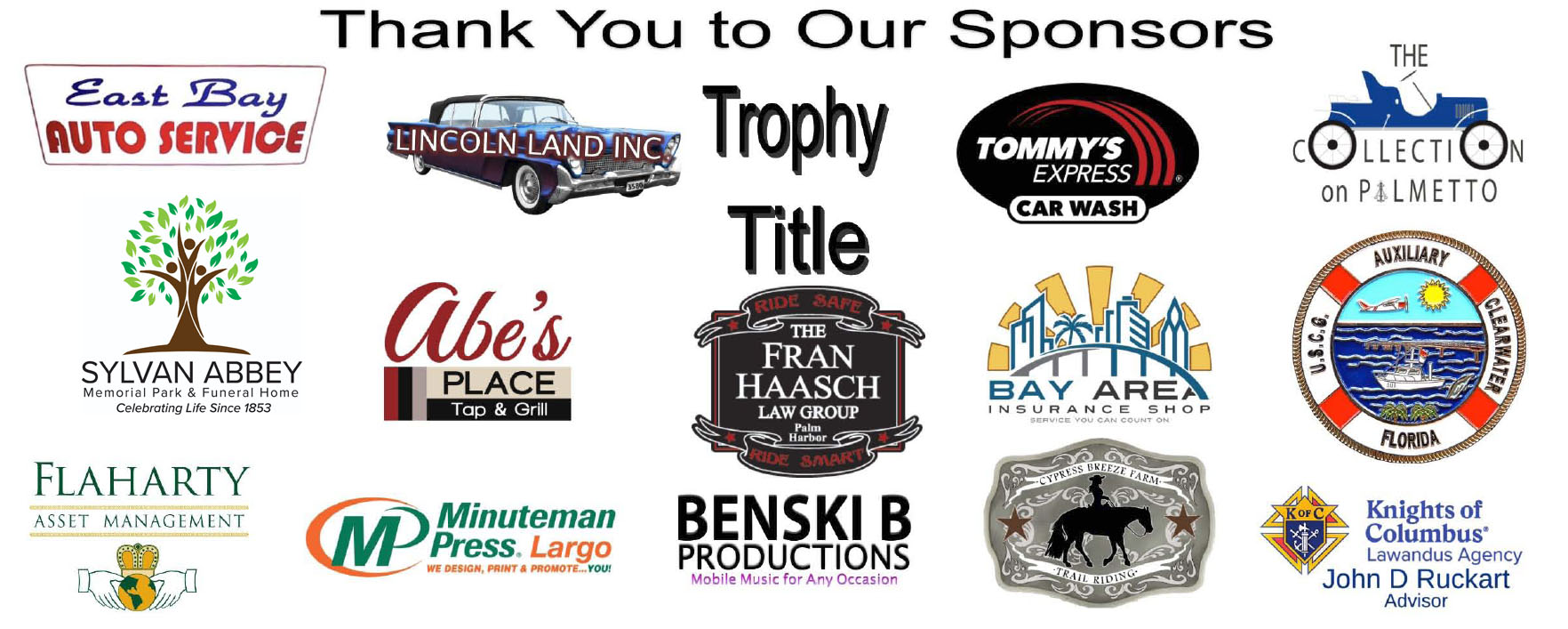 A big thank you goes out to our incredible sponsors – East Bay Auto Services Inc., The Fran Haasch Law Group, The Collection on Palmetto, Lincoln Land Inc, Tommy’s Car Wash, John D Rucket Advisor, Bay Area Insurance Shop, Benski B Productions, Minuteman Press Largo, Flaharty Asset Management, Cypress Breeze Farms, Abe’s Place, USCG Auxiliary, Sylvan Abbey Memorial Park & Funeral Home. Many have been with us from the beginning. They make all of this possible!